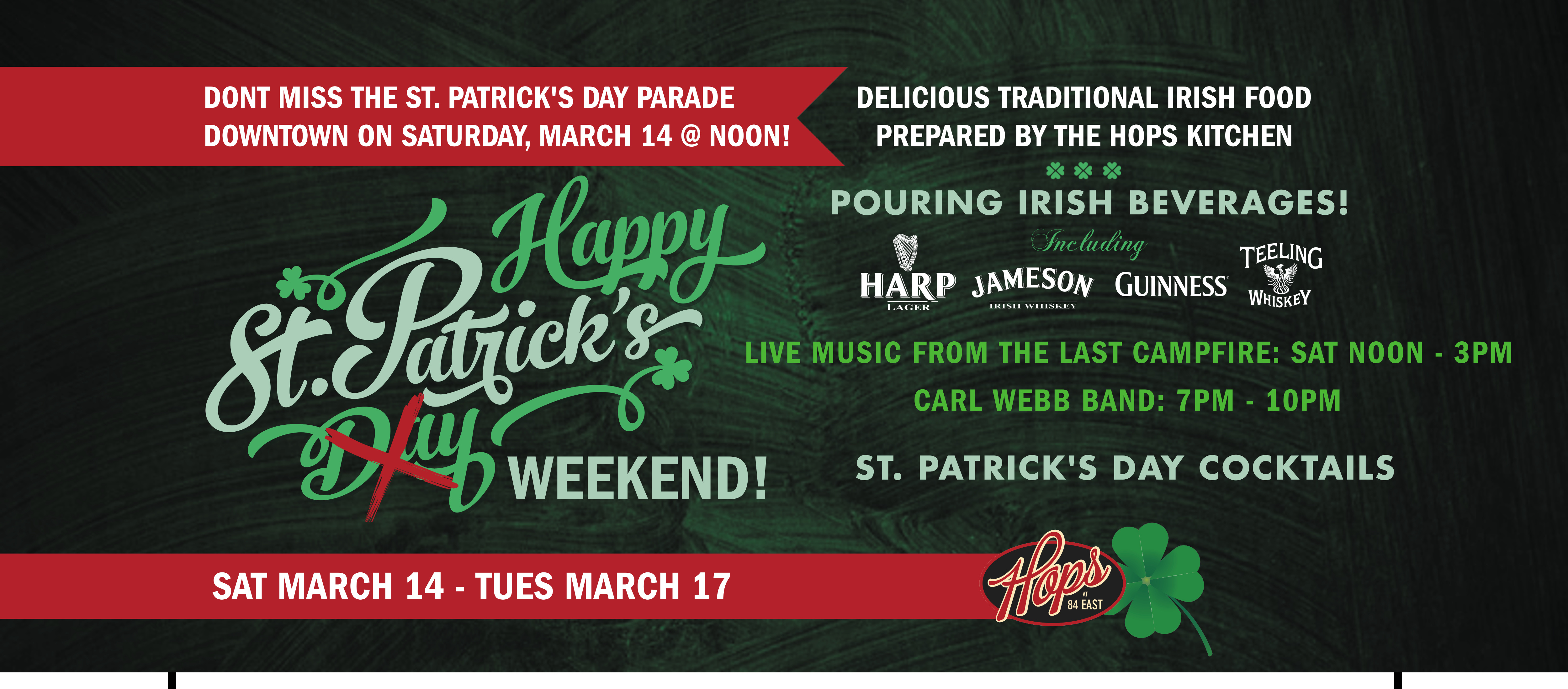 From Saturday, March 14th through St. Paddy’s Day, we are painting the town green! Whether you are hitting the Downtown Parade this Saturday at Noon or just looking for the perfect pint, we have the lineup you’ve been waiting for.